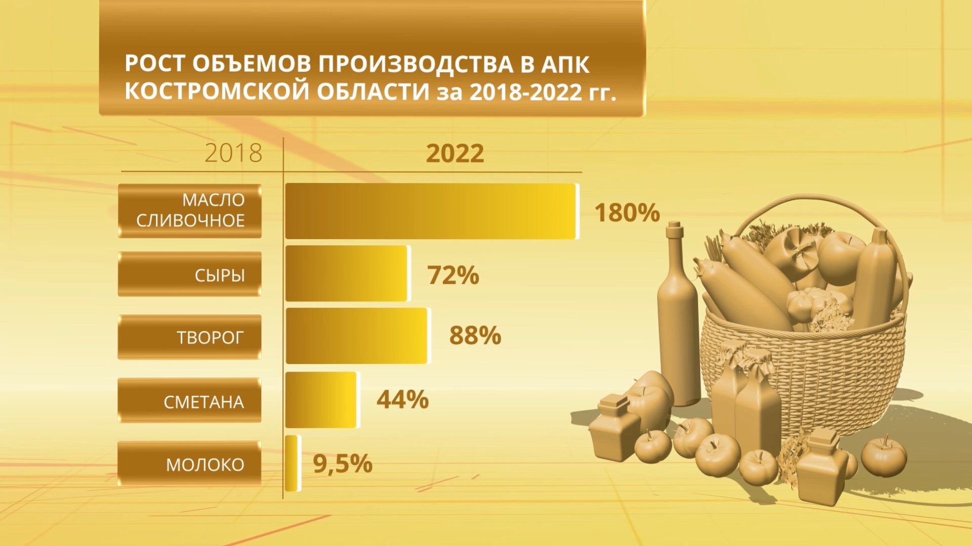 Здесь рассказали о том, как менялся индекс производства в сфере АПК в период с 2108 года по 2022-ой. Почти в 2 раза больше костромские аграрии стали выпускать творога и сыра. В полтора раза - рыбы и рыбных продуктов. Объемы выпуска молока выросли на 9,5%. Неплохой рост показали яйца и сметана: +44% у каждой категории. Производство мяса и колбасных изделий за 5 лет подросло в объеме на 14% и 12%, соответственно.