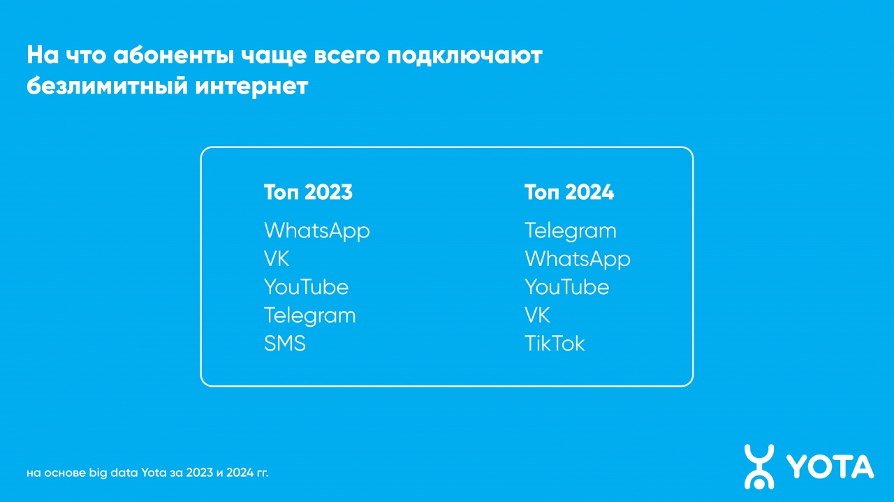 В то время как интерес к традиционным звонкам снижается, активность россиян в интернете растет. Любимым онлайн-сервисом россиян стал Telegram — именно на этот мессенджер в 2024 году абоненты чаще всего подключают безлимитный интернет, свидетельствует аналитика Yota. Однако значительная часть пользователей старше 30 лет все еще отдает предпочтение WhatsApp. В то же время на привычные звонки абоненты стали тратить на 14% меньше минут, чем в прошлом году.