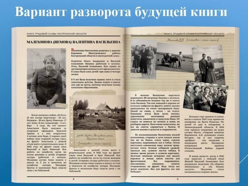 Книга трудовой славы Костромской области будет создана в двух форматах – печатном и электронном. Уже сегодня становится понятно, что собранного материала хватит на несколько томов, первый из них будет посвящен в целом Костромской области, другие – муниципалитетам. Цифровой вариант станет более расширенной версией, которую можно будет постоянно пополнять.