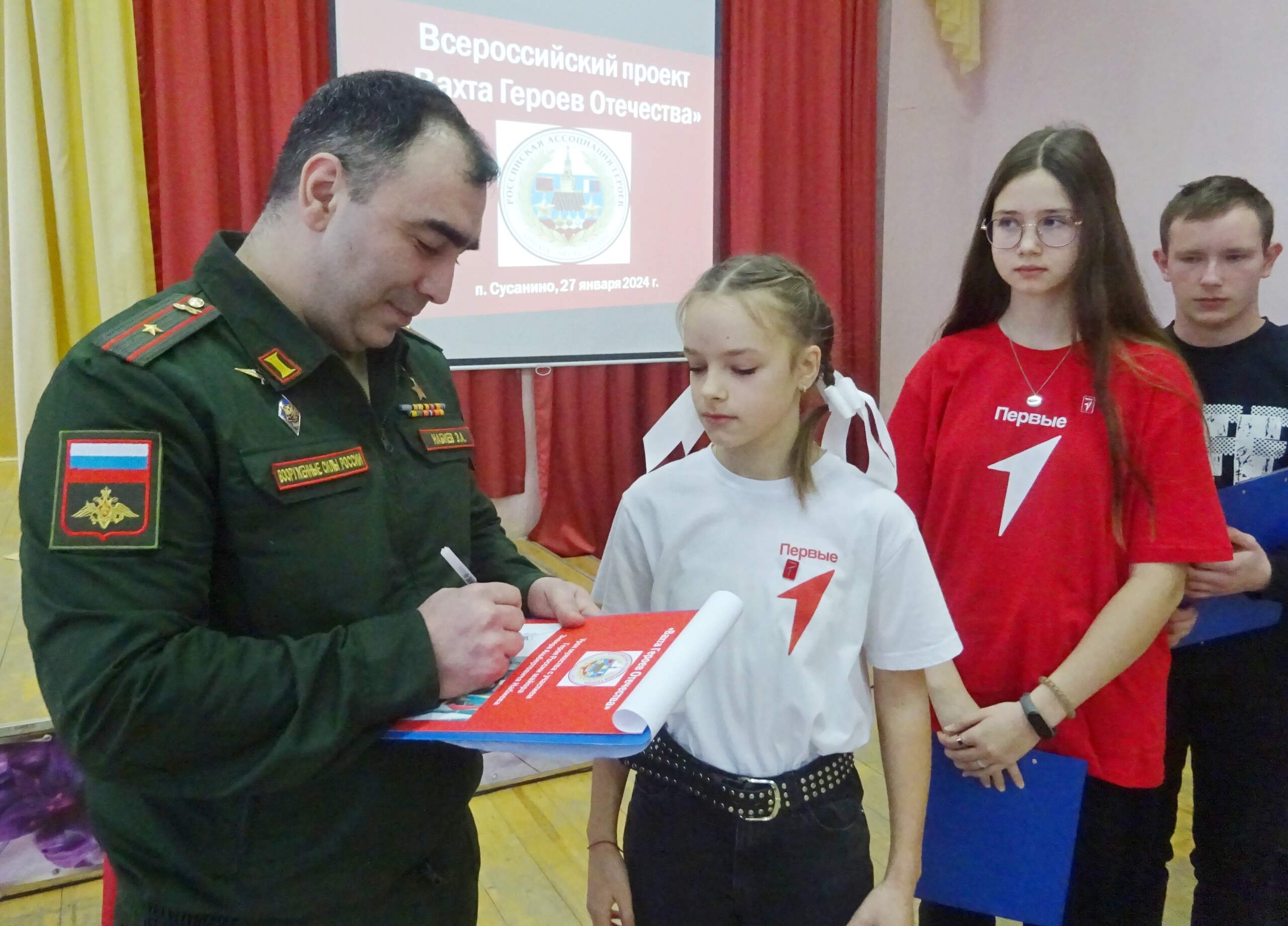 В рамках Всероссийской акции «Вахта Героев Отечества» в Сусанинской средней школе состоялся открытый Урок мужества с главным его участником, Героем РФ, заместителем командира танкового батальона Энвером Альбертовичем Набиевым.