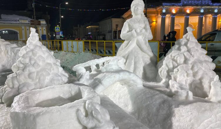 Скульптурные группы возводились в честь 200-летия со дня рождения драматурга Александра Николаевича Островского и были посвящены его творчеству. Уникальные филигранные работы из льда и снега воспроизводили скульптуру самого драматурга, очертания костромского драмтеатра, самых известных героев и, конечно, Снегурочку. На подготовку скульптур отводилось 4 дня и наконец сегодня костромичи смогли увидеть итоги этой работы.