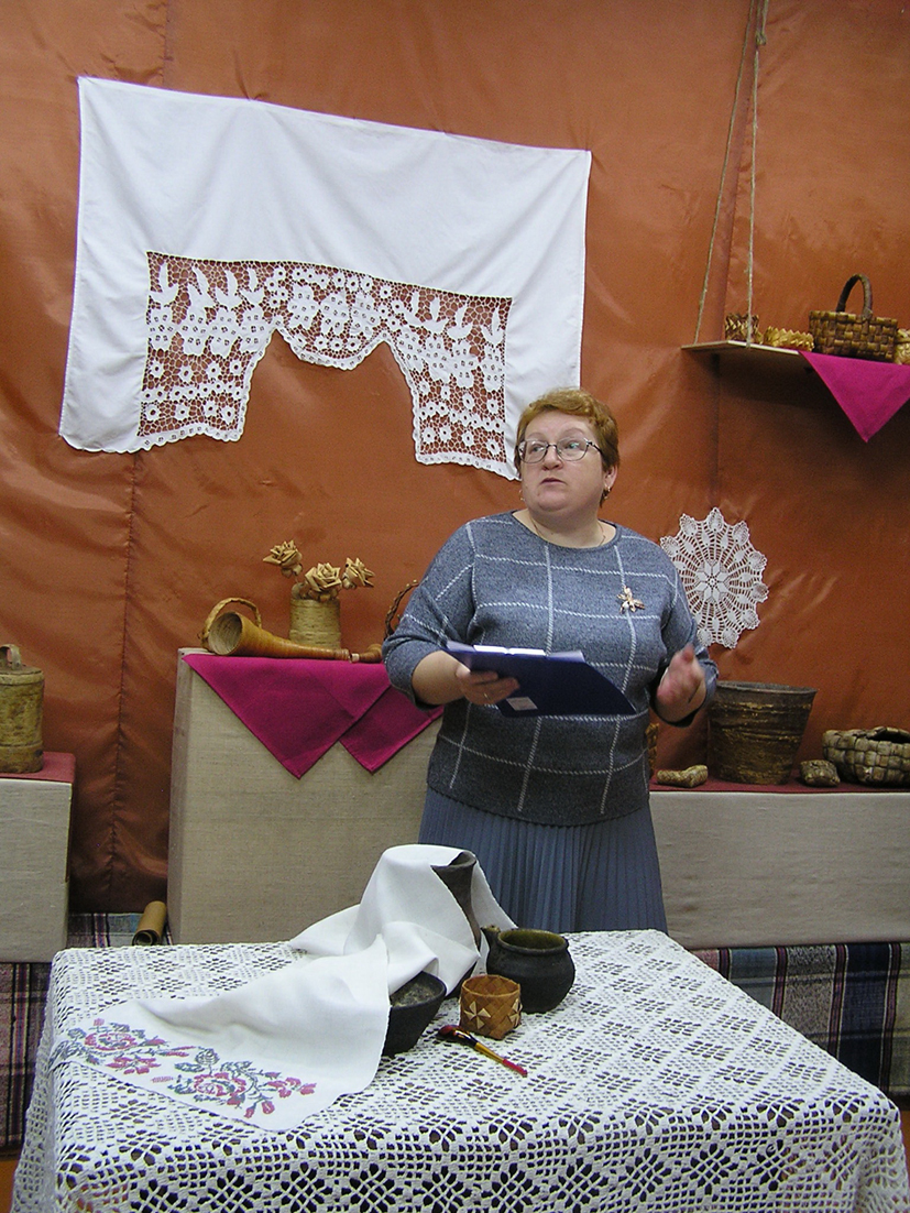 OLYMPUS DIGITAL CAMERAА затем пьедестал праздника полностью заняла красавица берёзка. В России её произрастает свыше двух десятков видов: повислая, бородавчатая, карликовая и т. д. Очень важное в народном промысле дерево. Ирина Александровна познакомила собравшихся с выставкой изделий из бересты. Как только она не применялась народными умельцами в старину! На обозрение гостям представлены солонки, корзинки, набирушки, большие пестери для грибов и ягод, малые пестери для рыбы и туеса (бураки) для хранения продуктов, которые крестьяне брали на полевые работы, и т. д. Содержимое, положенное в эти берестяные изделия, долго не портилось. А каковы берёзовые сапожки со скрипом! Лапти, ступни… Хороша и экологична обувка, да ещё и не промокает! Ирина Александровна рассказала, как снять с берёзы бересту, не нанося дереву большого вреда.