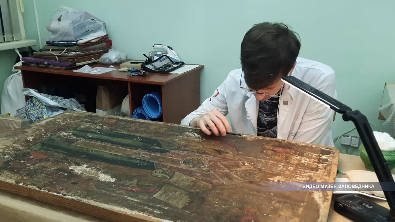 Одна из икон, над которой здесь трудились, была под плотным слоем старых реставрационных заклеек. Согласно документам, экспонат обнаружили в 70-80 годы прошлого века во время экспедиций. Что скрывалось под бумагой, никто не знал. Чтобы снять ее, потребовались десятки часов кропотливой работы. В итоге открылось изображение Николая Чудотворца. Он изображен в полный рост. В левой руке Евангелие. В верхней части иконы изображения Иисуса Христа и Богоматери. В нижней, предположительно, сцены из жизни святого. Как отмечают эксперты, состояние реликвии достаточно хорошее. Художник работал качественными красками и творёным серебром. Всего скорее, икона относится к концу 18 началу 19 веков.