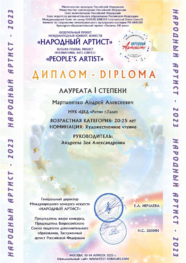 В номинации художественное чтение Андрею Мартыненко присвоено звание Лауреата I степени, за исполнение стихотворения Евгения Евтушенко "Идут белые снеги".