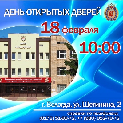 Мероприятие состоится 18 февраля в 10.00. по адресу: г. Вологда, ул. Щетинина, 2. Гостей ждет встреча с руководством ВИПЭ ФСИН России, презентация факультетов и экскурсия по учебному заведению.