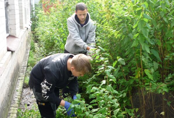 В рамках программы временного трудоустройства несовершеннолетних граждан, учащиеся средней школы № 1 города Макарьева Костромской области активно принимают участие в благоустройстве территории у своего учебного заведения. Возраст участников программы составляет от 14 до 18 лет.