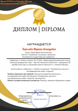 Марина Леонидовна стала в этом конкурсе победителем 3-й степени. Кроме того, в дополнительной номинации конкурса «Руководитель научных и исследовательских работ студентов» она стала победителем 1-й степени.