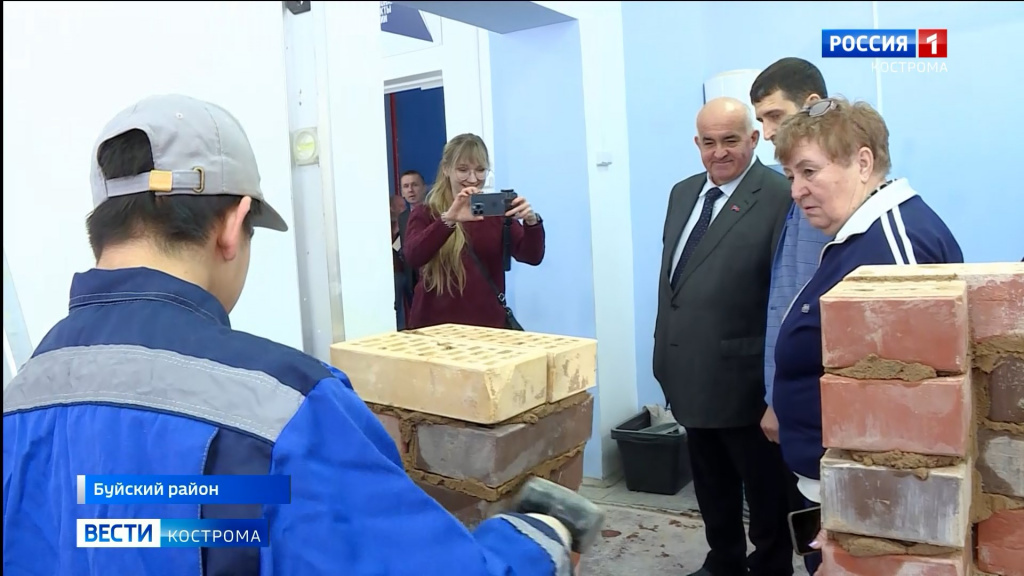 Педагоги буйского техникума показывают губернатору обновленную мастерскую для будущих строителей. Совсем недавно по президентскому нацпроекту «Образование» здесь сделали капитальный ремонт, закупили современное оборудование. Работать на нем студентов учит Серафима Петровна Хильченко - педагог с 40-летним стажем. Губернатору она рассказывает - её ребята уже зарекомендовали себя на всероссийских стройках. Так, в прошлом году, стройотряд старшекурсников успешно трудился на возведении объекта атомной промышленности. А первокурсники пока лишь осваивают азы профессии.
