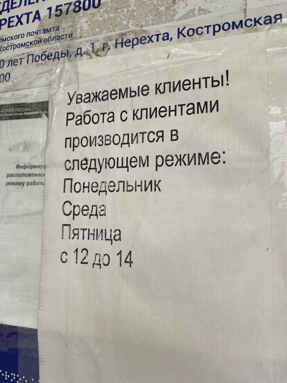 Да что там сёла и деревни! В социальных сетях люди рассказывают, прилагая фотографии, что и в самой Нерехте отделение «Почты России» работает не каждый день, а по определенному графику. Так то районный центр!