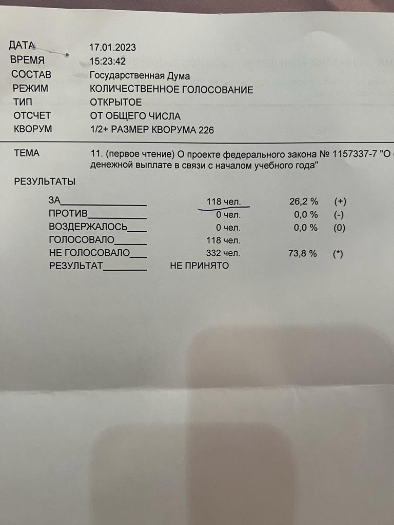 17 января в Государственной Думе состоялось открытое голосование по законопроекту о денежной выплате в связи с началом учебного года.