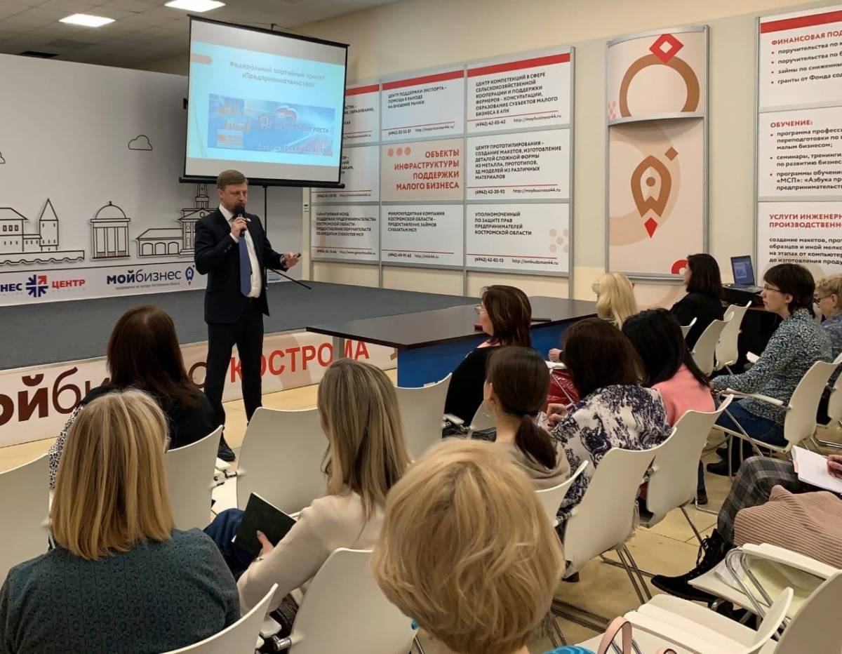 Региональные координаторы федеральных проектов партии «Единая Россия» «Предпринимательство» Евгений Зимняков и «Женское движение» Наталья Давыдова организовали бесплатный семинар, который прошел в Костромском бизнес-центре и собрал 25 самозанятых граждан региона.