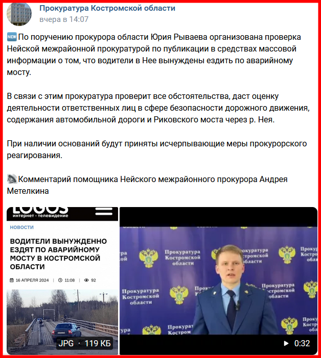 Этим фактом заинтересовалась прокуратура Костромской области. У себя в социальных сетях ведомство сообщает, что по поручению прокурора Юрия Рываева Нейской межрайонной прокуратурой организована проверка в связи с тем, что люди ездят по аварийному мосту. Будут проверены все обстоятельства, дана оценка деятельности ответственных лиц в сфере безопасности дорожного движения, содержания автомобильной дороги и Риковского моста через реку Нея. При наличии оснований будут приняты исчерпывающие меры прокурорского реагирования.