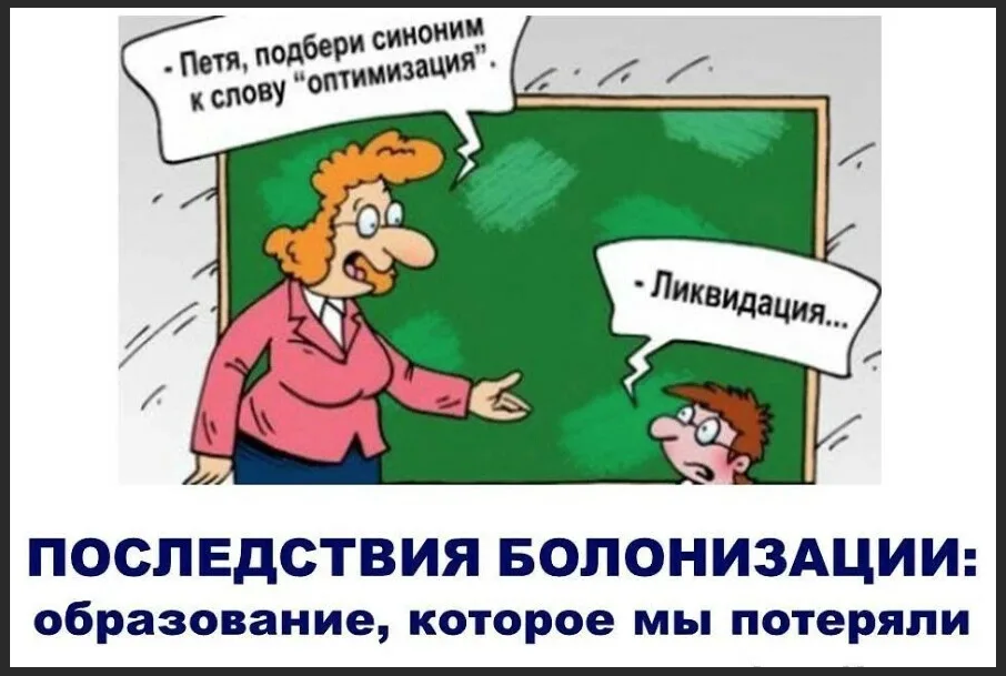 Если и говорить об отходе от навязанной нам системе образования, то логичнее предложить вернуться к старому-доброму специалитету. Отучился 5 лет — стал специалистом. Решил учиться дальше, идёшь в аспирантуру. И никаких «болонок», «болванок» и прочих фантазий от власть имущих.
