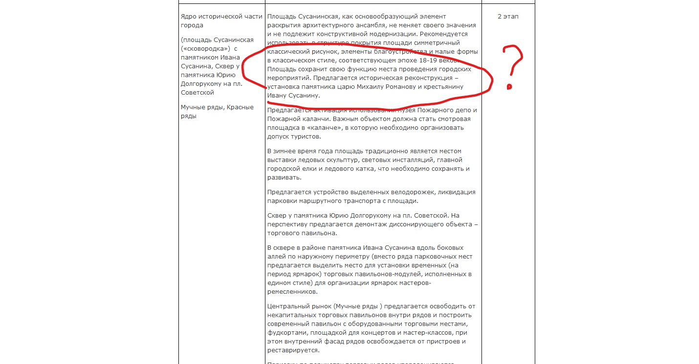 Однако на сайте городской администрации есть любопытный документ , он называется «Концепция развития Центральной (исторической) части города Костромы». Так вот, там русским языком написано: предполагается историческая реконструкция, установка памятника царю Михаилу Романову и крестьянину Ивану Сусанину. Чтобы не утруждать вас поисками данного текста, мы прилагаем скриншот, где это написано.