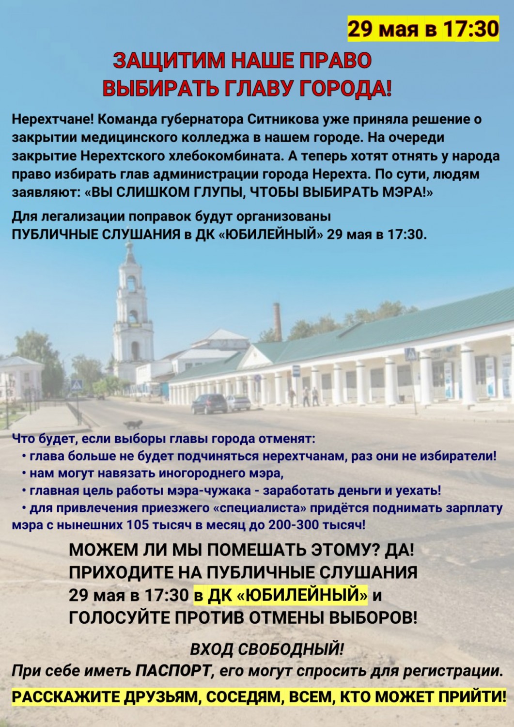 Нерехтские коммунисты выступают против отмены прямых выборов мэра города. Публичные слушания по данному вопросу состоятся 29 мая в ДК «Юбилейный», в 17:30. Если нас читают жители Нерехты, просим присоединиться и принять участие. Обязательно возьмите с собой паспорт!