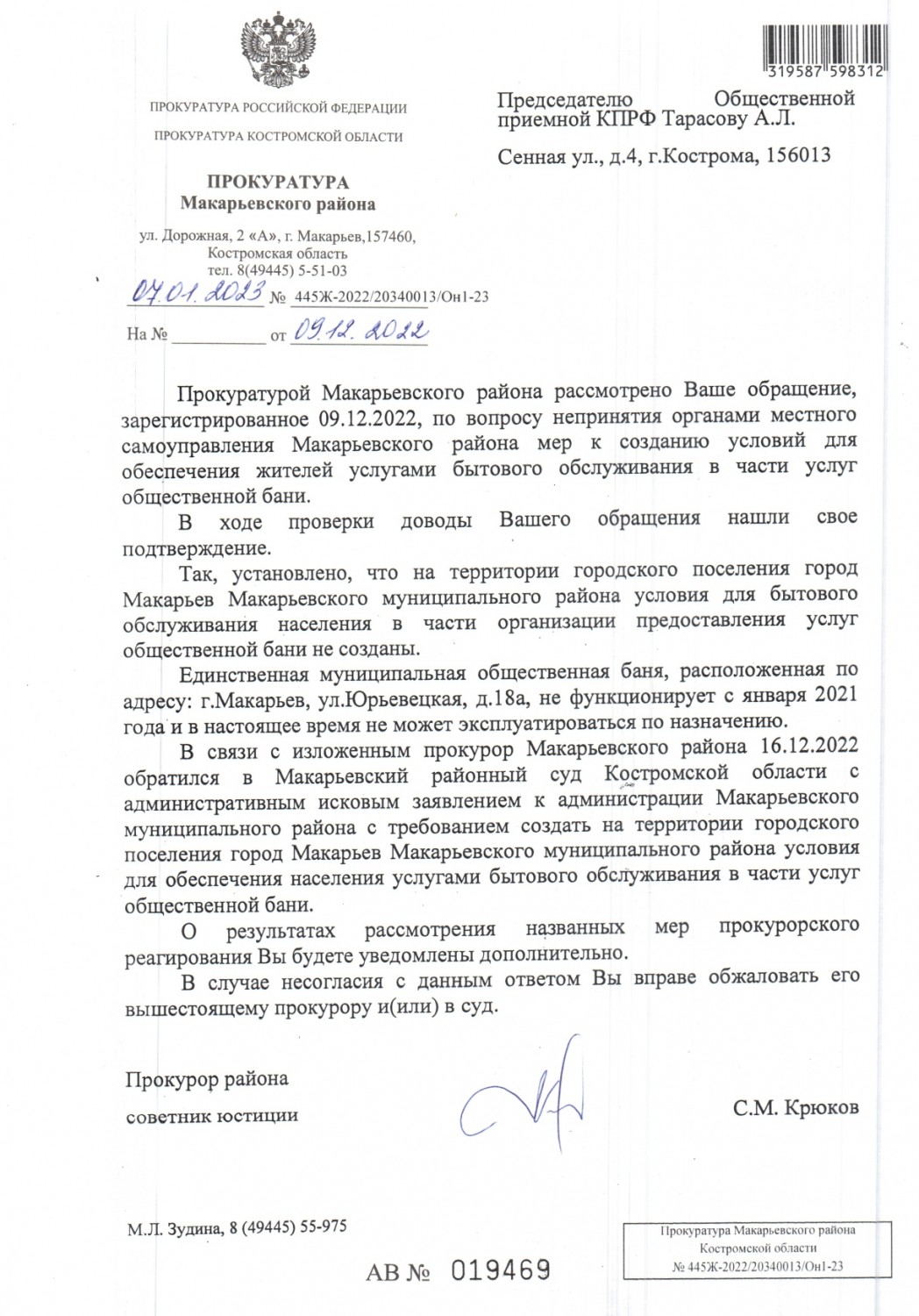 К решению проблемы подключился председатель Общественной приёмной КПРФ Андрей Тарасов, он написал жалобу в прокуратуру Макарьевского района, в которой потребовал обязать Макарьевскую администрацию восстановить имеющуюся на территории городского округа единственную общественную баню.
