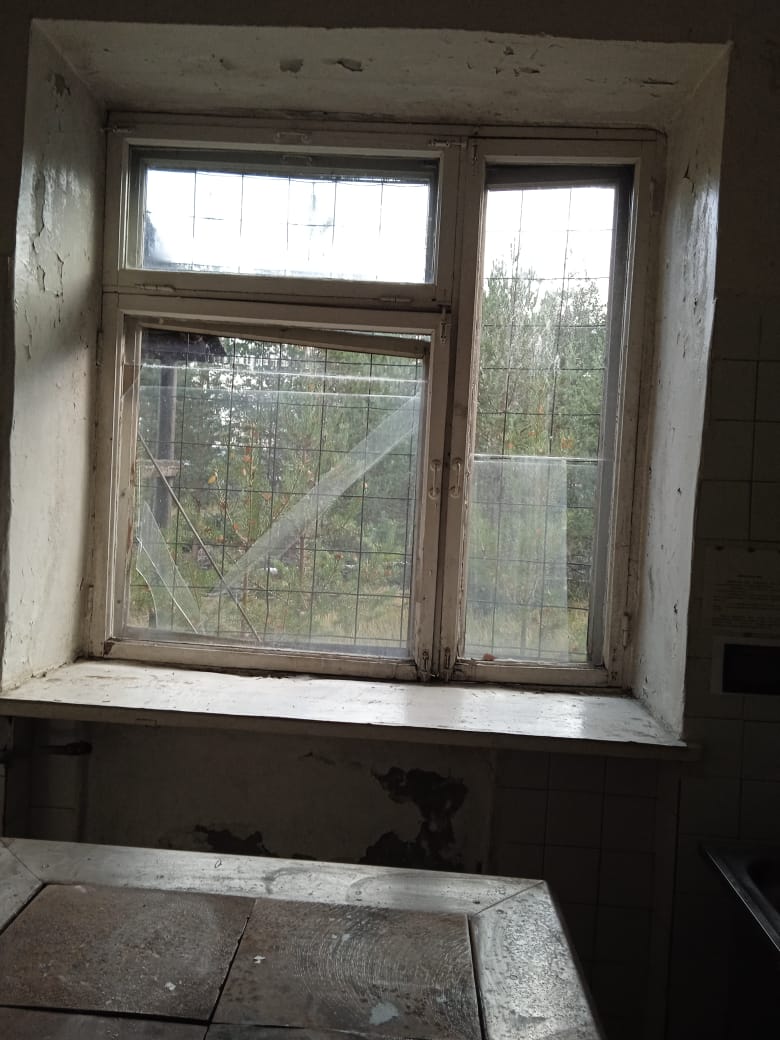 Пол, стены, потолок — все в сколах, покрытие обваливается, рискуя упасть либо на голову работнику, либо в кастрюлю с едой. Всё покрыто плесенью, в том числе из-за неработающей вентиляции. Отличные условия для приготовления пищи, ничего не скажешь!