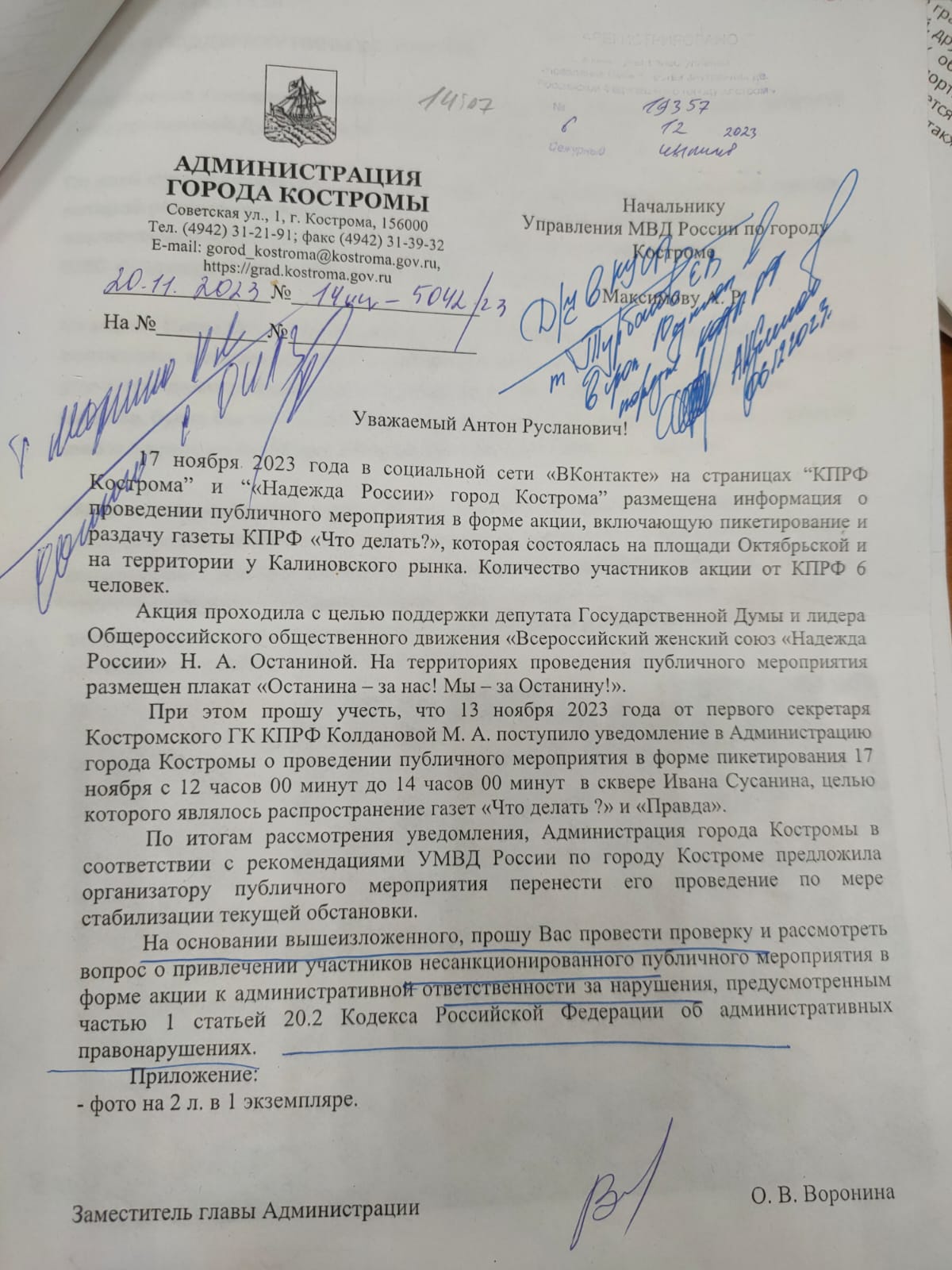 Около месяца назад костромские коммунисты и активисты ВЖС «Надежда России» проводили акцию в поддержку депутата ГосДумы Нины Останиной. И сегодня к нам… нагрянула полиция.