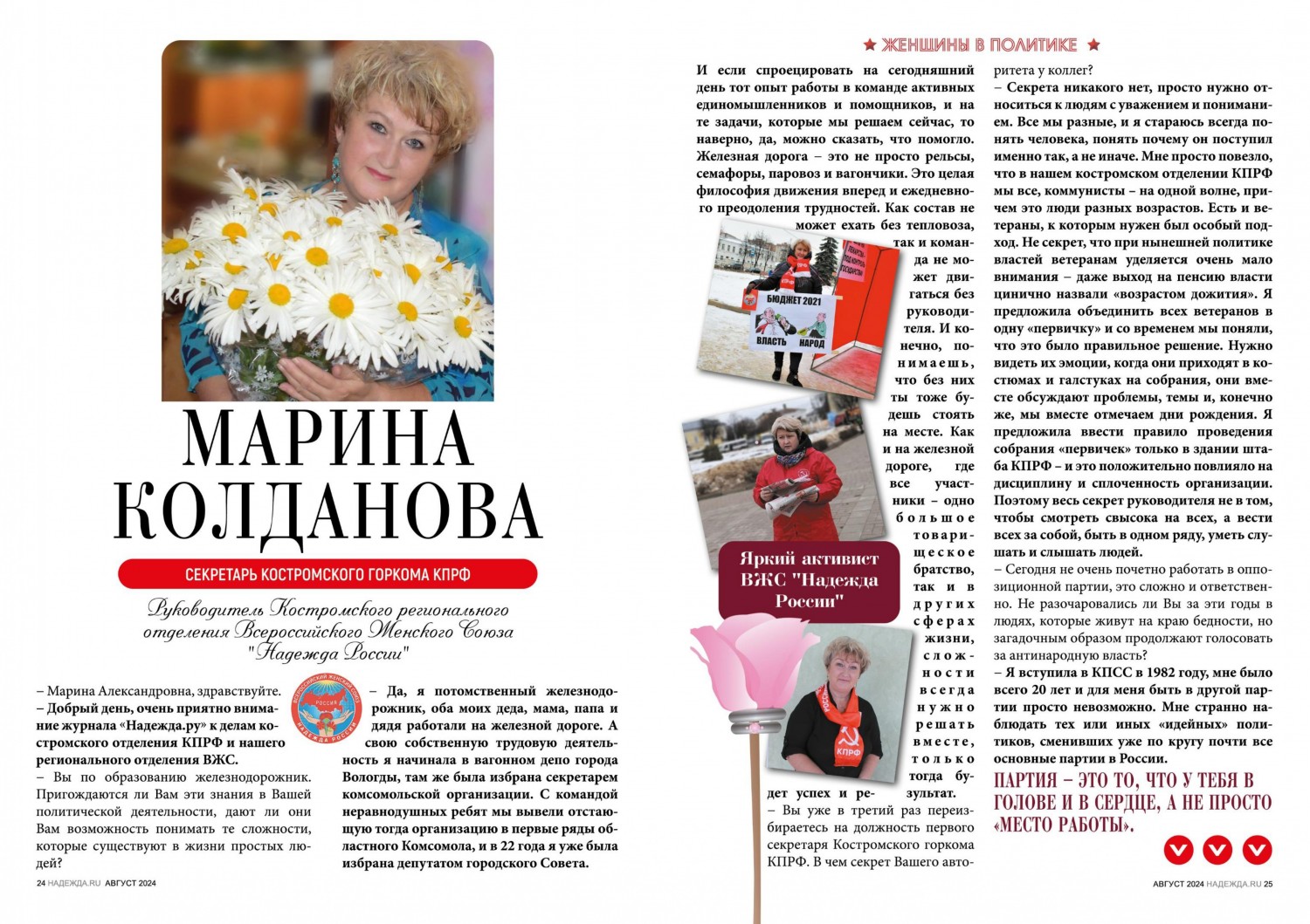 А вы знаете, что Всероссийский женский союз «Надежда России» выпускает свой журнал? Он называется «Надежда.RU» и выходит раз в месяц. В свежем, августовском номере этого издания вышло интервью с первым секретарём Костромского городского отделения КПРФ Мариной Колдановой, которая также является председателем регионального отделения ВЖС «Надежда России».