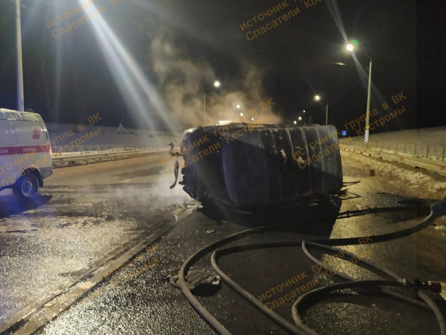 По предварительным данным водитель автомобиля УАЗ -"буханка" не справился с управлением врезался в отбойник и перевернулся. Автомобиль вспыхнул.