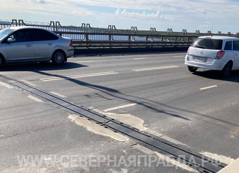 Здесь продолжают ремонтировать деформационные швы. Работы подрядчик проводит на двух полосах по направлению в сторону Заволжья: на этой части переправы повреждения дорожного покрытия самые сильные.