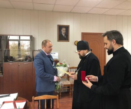 Епископ Алексий поздравил главу города с наступившим юбилеем, 45-летием, и наградил медалью Феодоровской иконы Божией Матери 2-ой степени, а также подарил букет цветов.
