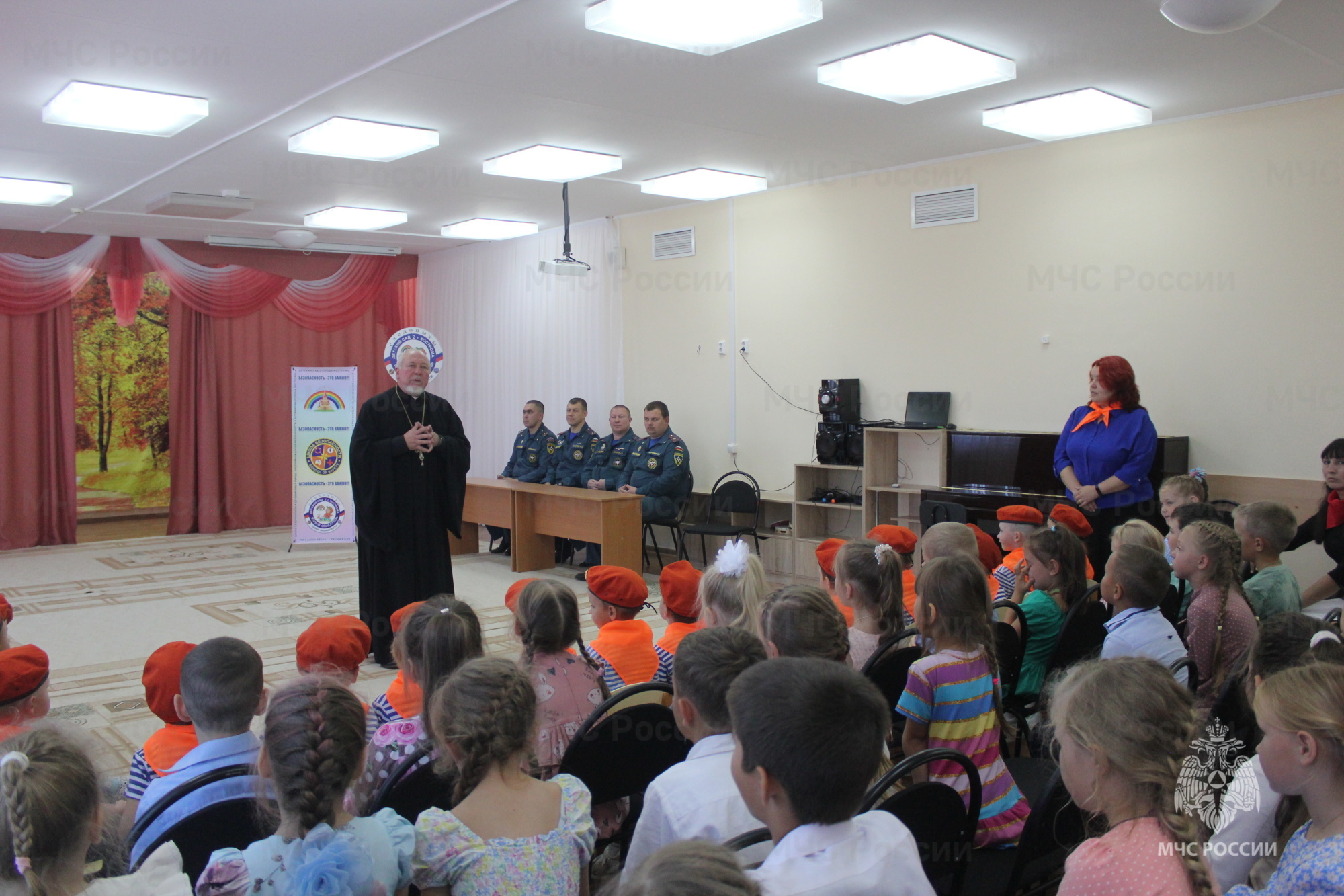 Протоиерей Димитрий Сазонов побеседовал с детьми, а также благословил пожарных и пожелал им здоровья и мира в семье. Сотрудники МЧС в рамках занятия повторили с дошколятами правила безопасности, а также напомнили номера экстренных служб.