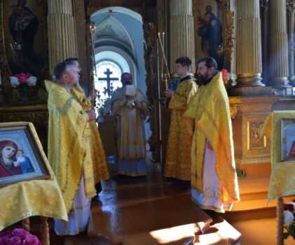 Преосвященному владыке сослужили: настоятель храма иерей Андрей Маслов и настоятель храма праведного Иоанна Кронштадтского п.Островское протоиерей Андрей Мухачев.