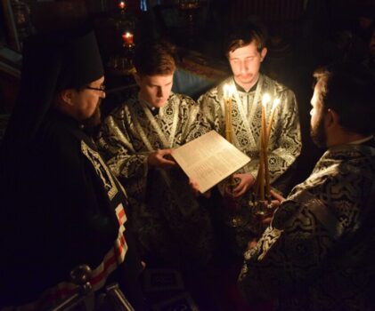 По завершении канона архипастырь и духовенство продолжили молиться на великом повечерии.