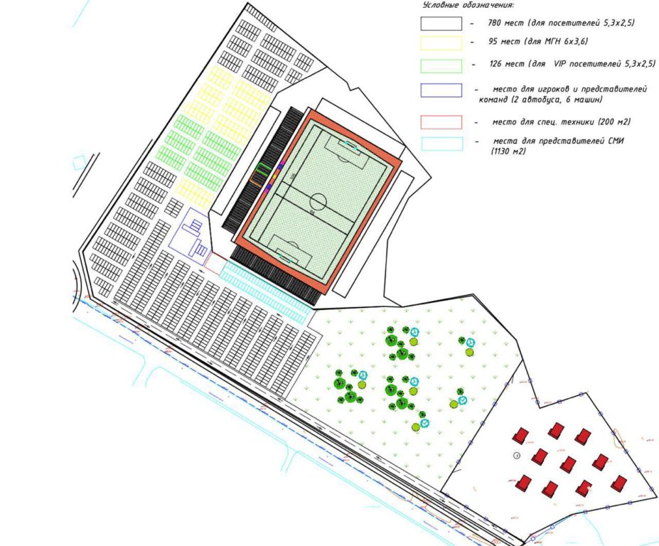 Стадион построят в поле за строительным магазином «Леруа Мерлен». Исходя из эскиза, арену возведут в «английском стиле» — без беговых дорожек и с трибунами, размещенными максимально близко к полю. На них выделят отдельные VIP-ложи, места для СМИ и маломобильных болельщиков.