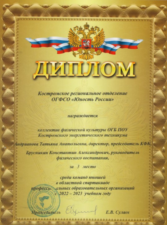 В течение 2022 – 2023 учебного года в рамках реализации проекта «Физкультура и спорт», работы студенческого спортивного клуба «Энергетик», руководителем которых является руководитель физического воспитания Брусникин Константин Александрович, студенты Костромского энергетического техникума принимали участия в областных спортивных соревнованиях.