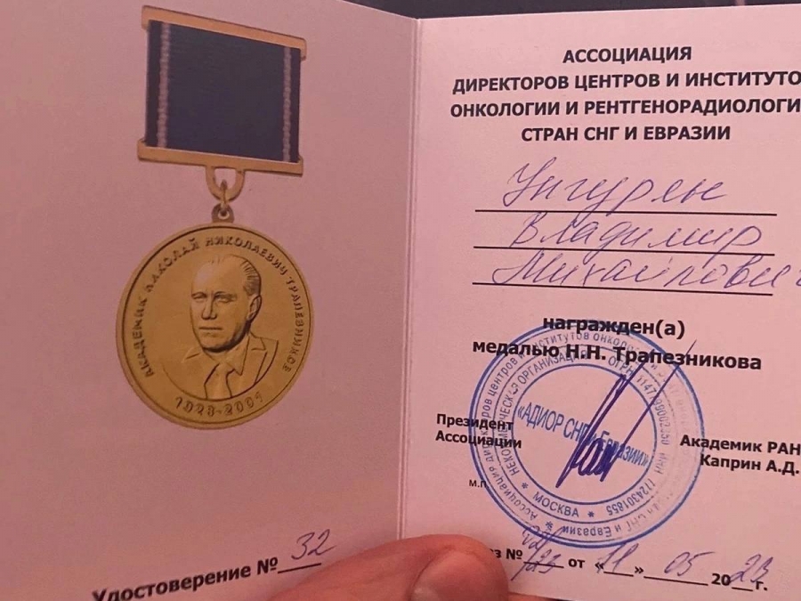 Медаль Владимиру Унгуряну была вручена вчера на XII съезде онкологов России.