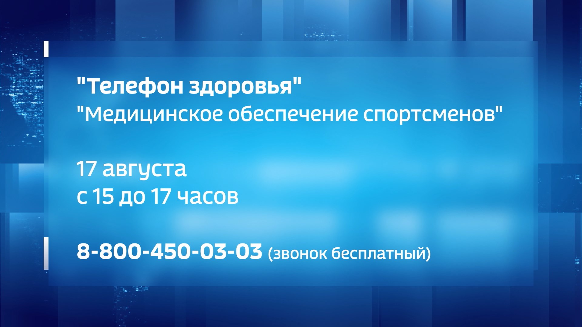 Ольга Александровна Седова ответит на вопросы, касающиеся медицинского обеспечения спортсменов. Время для консультаций - с 15:00 до 17:00. Звонки принимаются по бесплатному номеру: 8-800-450-03-03.