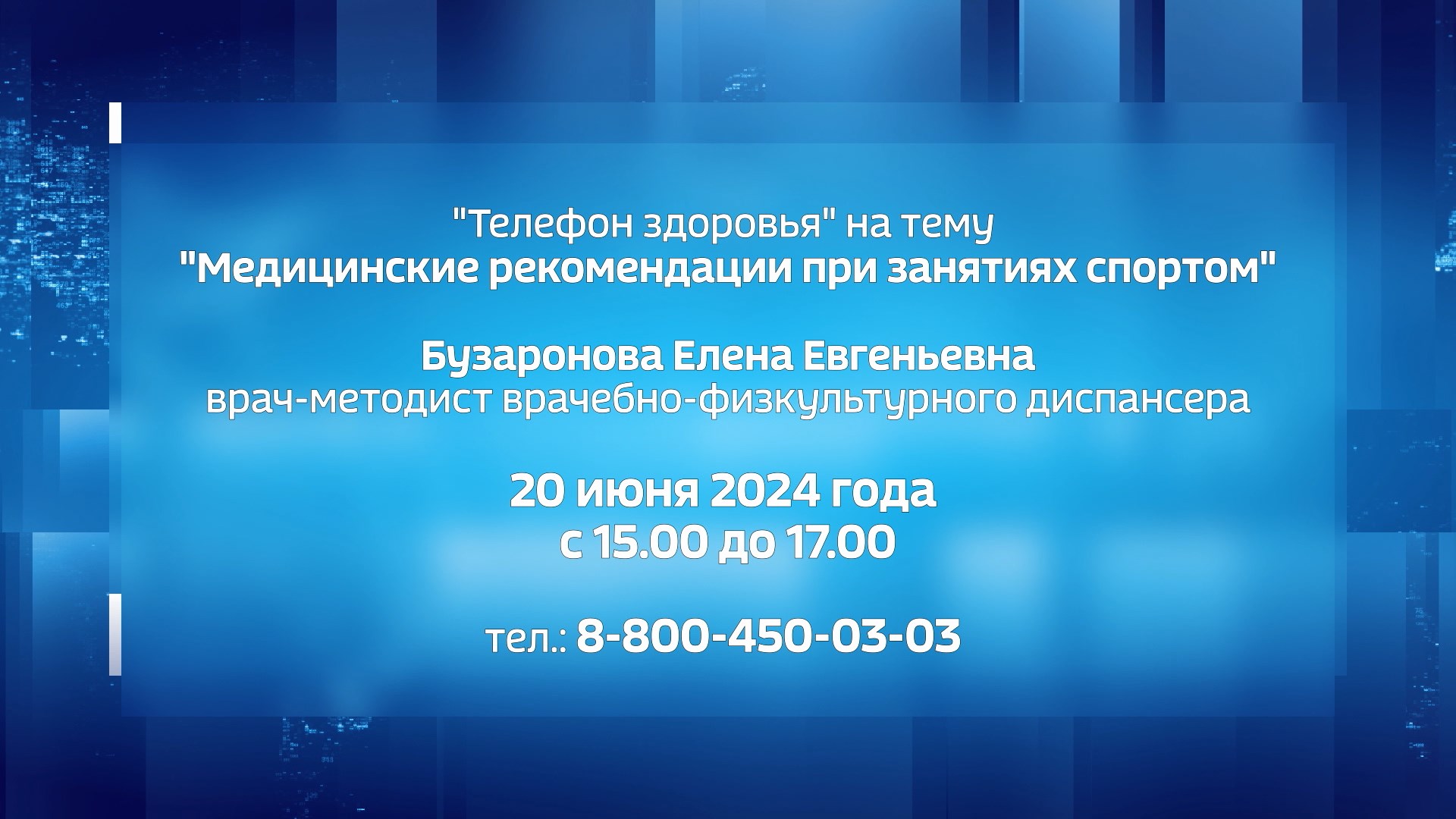 Его тема - медицинские рекомендации при занятиях спортом. Всех желающих проконсультирует врач-методист врачебно-физкультурного диспансера Елена Бузаронова. Номер «телефона здоровья»: 8-800-450-03-03. Специалисты отвечают с 15:00 до 17:00 часов. Звонить можно с мобильного, просто набрав номер, или со стационарного аппарата. Для этого на телефоне нужно нажать «звёздочку», а затем цифру 1. Также вопросы по этой теме можно задать на сайте «телефона здоровья».