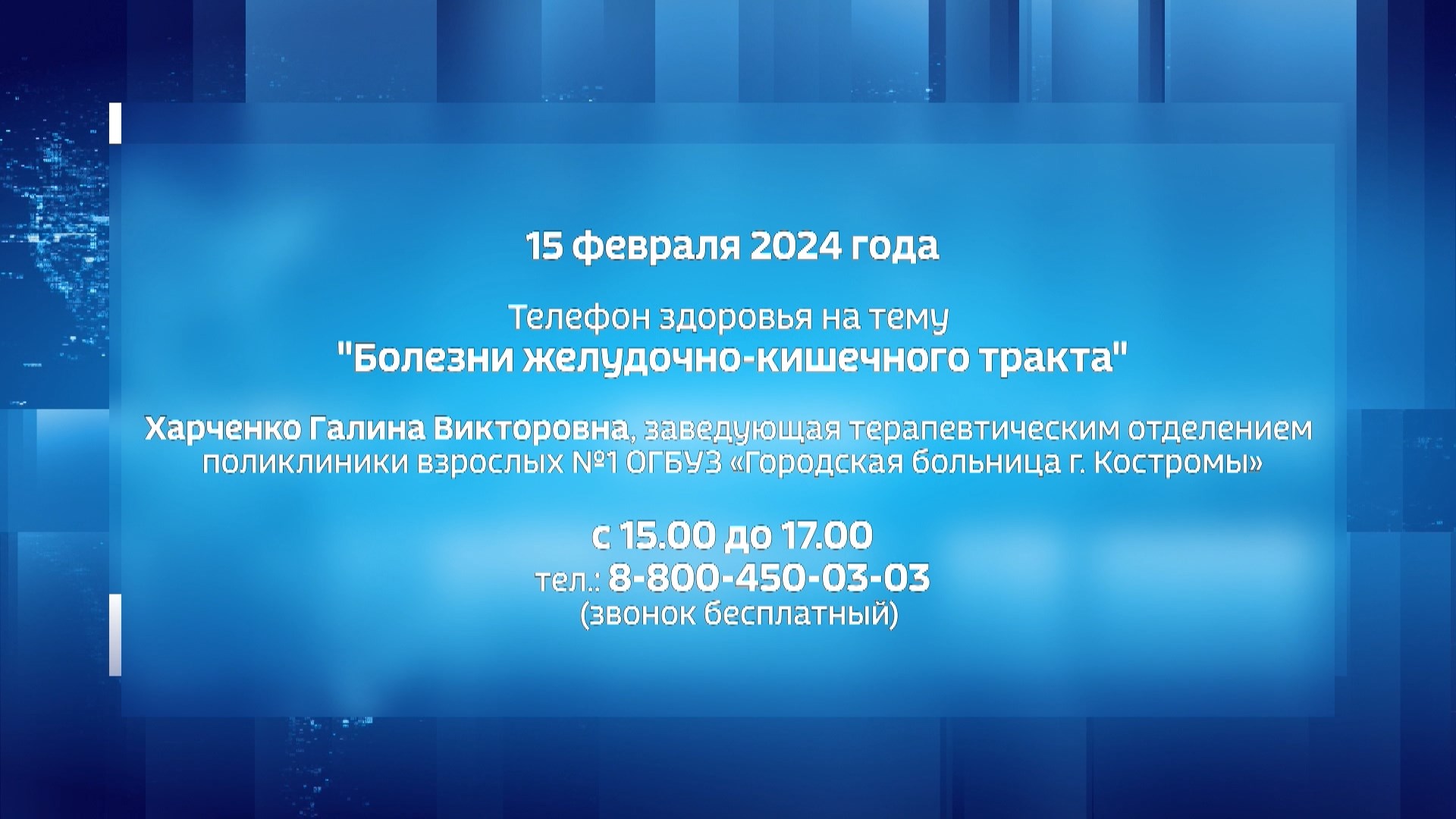 На вопросы жителей ответит Галина Викторовна Харченко, заведующая терапевтическим отделением поликлиники взрослых костромской Городской больницы. Она расскажет костромичам о факторах, влияющих на здоровье пищеварительной системы, о мерах профилактики заболеваний и где можно получить медицинскую помощь по этому профилю. Время консультаций с 15:00 до 17:00. Телефон: 8-800-450-03-03.