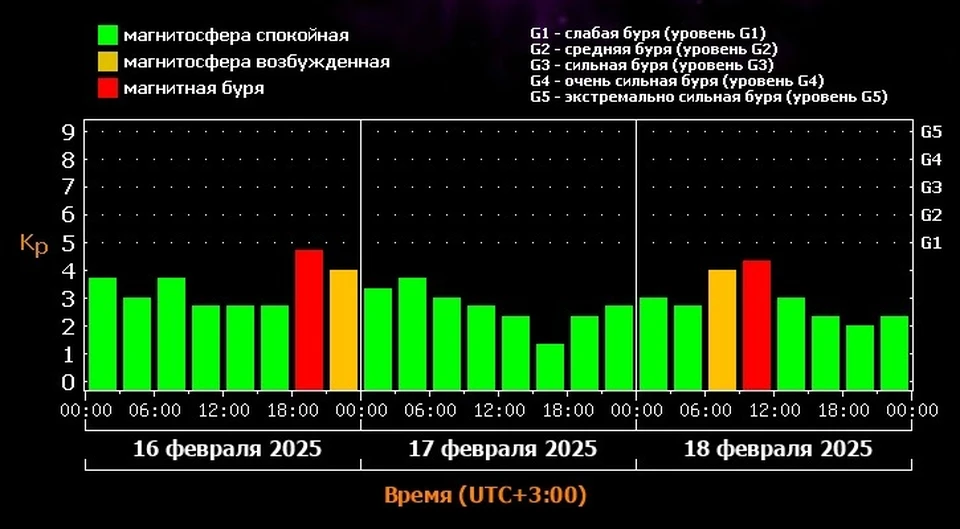 Буря начнётся в районе 6:00 утра и достигнет своего пика между 9:00 и 12:00. Её уровень будет слабым. После 12:00 магнитосфера успокоится.