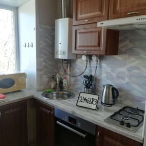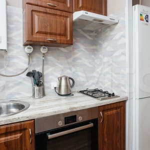 - На кухне: холодильник, электрическая духовка, электрический чайник, микроволновка, чай, сахар, соль, посуда и столовые приборы на 4 персоны