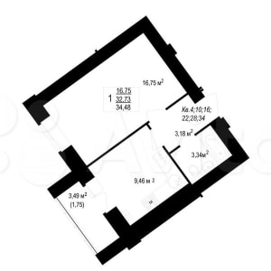 - Общая площадь: 34.5 м²